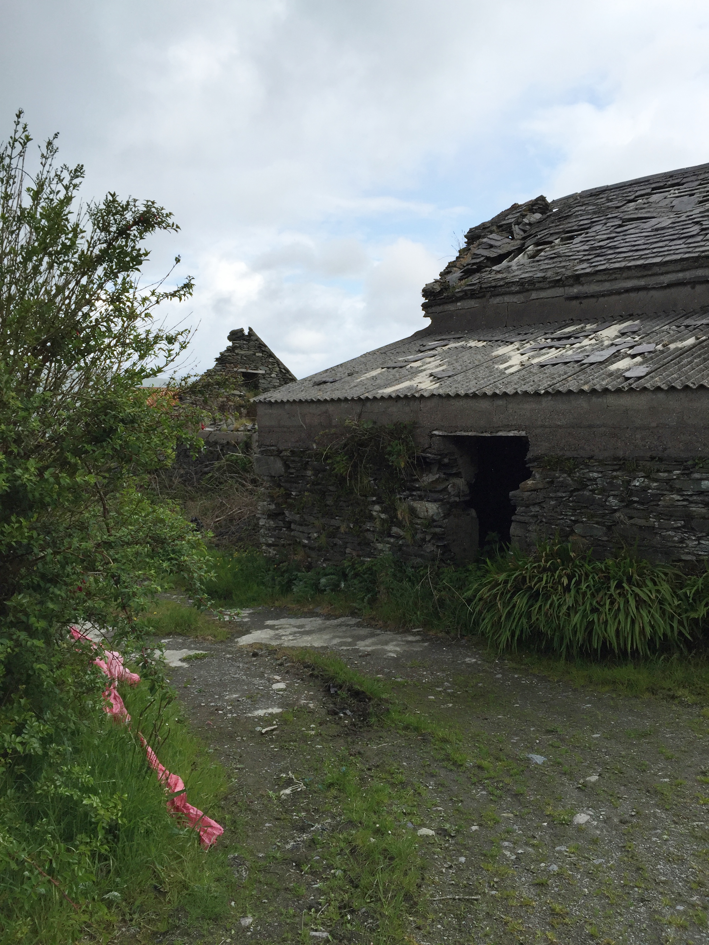 We left Balleyseede Castle and headed for the “Ring of Kerry” drive. Just before we reached Portmagee, we turned at what was once called Burchell’s Crossing [over a 100 years ago] and drove to the farm where Bill’s great grandfather had a dairy farm for over 40 years. The lane in was gated and padlocked shut so Morgan and I stayed behind while Christy climbed the gate and took some pictures of the old buildings.
